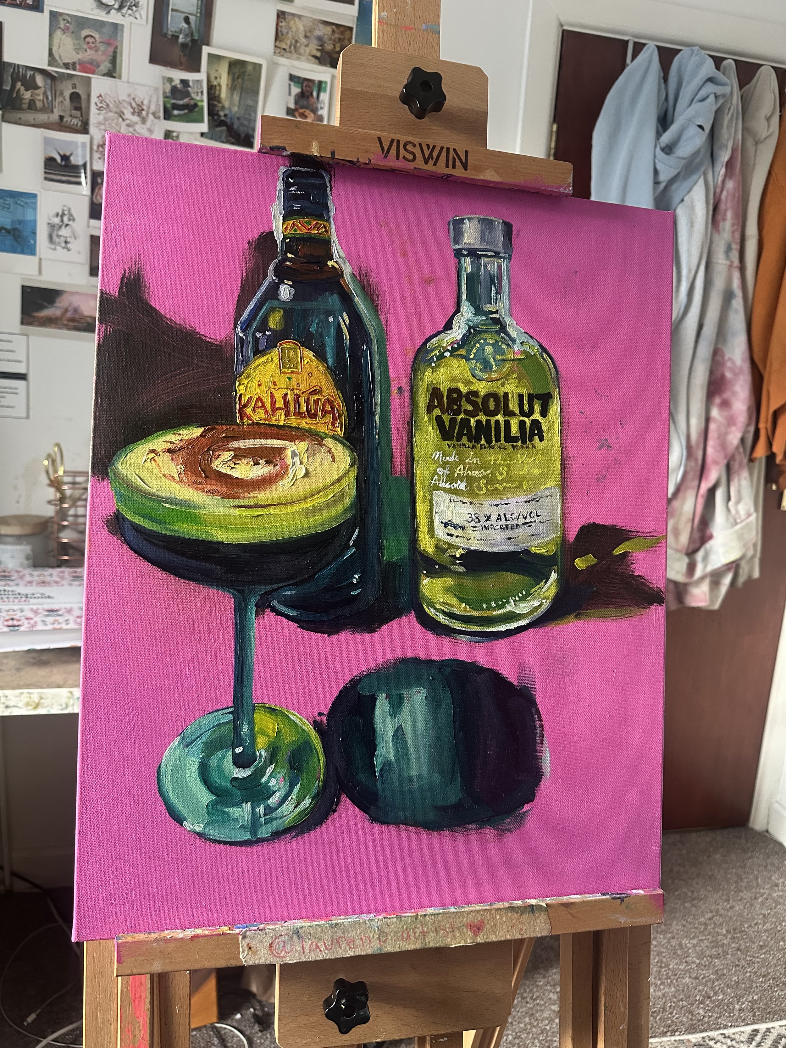 I’m currently working on my Spring collection, and I’m in the middle of my biggest piece for it–an espresso martini in a funky green glass, with a bottle of Kahlúa and Absolut Vanilia vodka behind it. Today’s goal is to finish the Absolut bottle, which means tackling the top of the bottle and all of the text.
