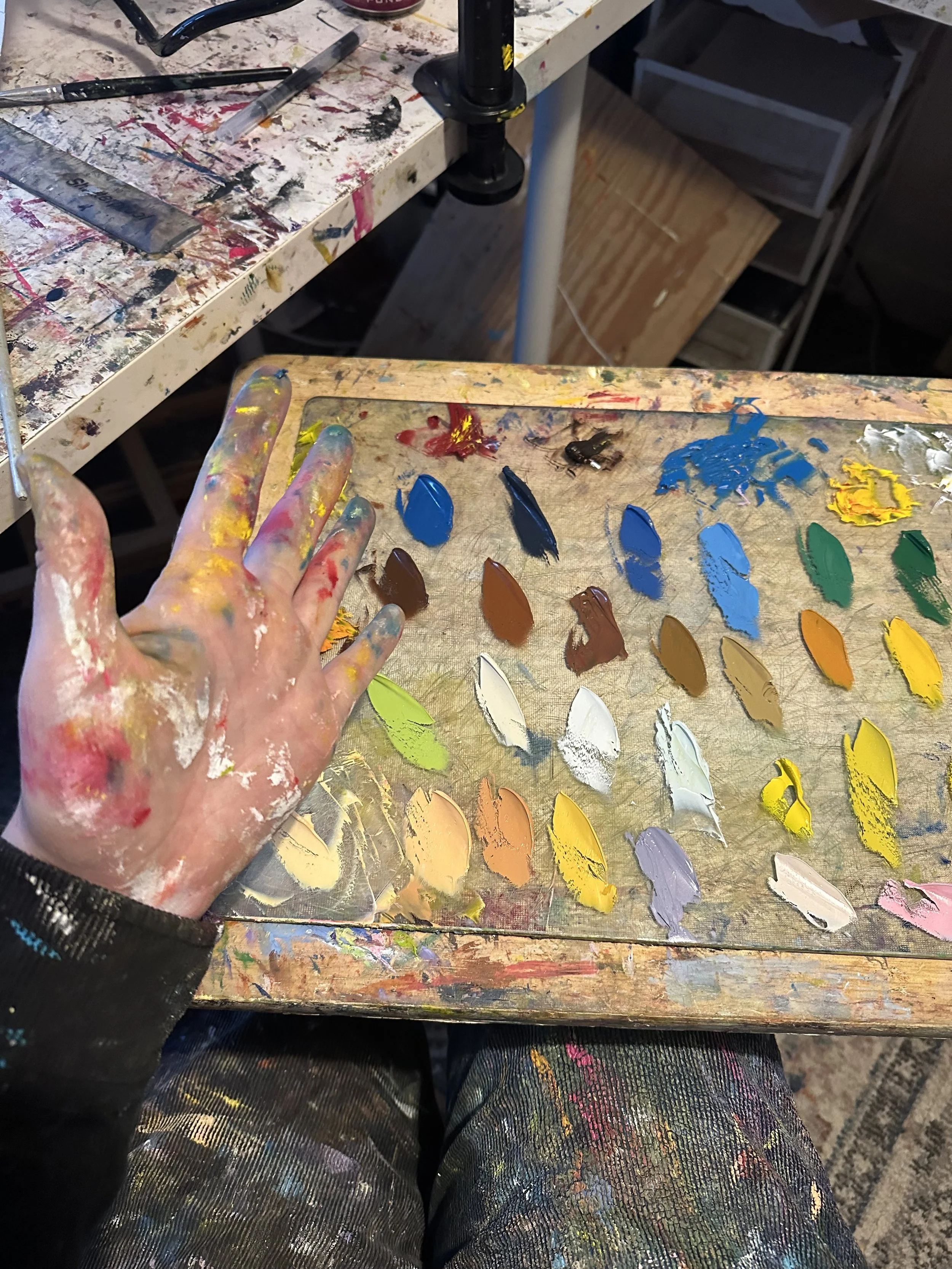All my colours are mixed for the day. It takes a long time, but I genuinely enjoy this part; it’s messy and kind of meditative. I clean myself up and take a short break before starting my painting session.